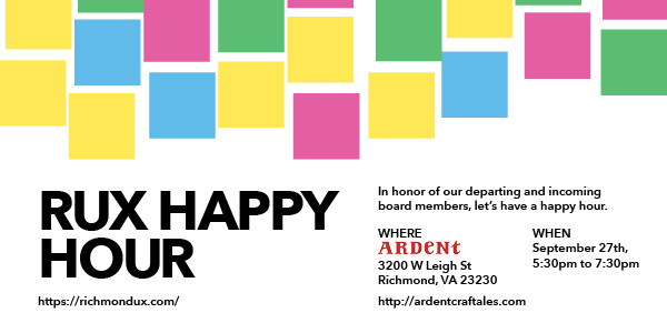 In honor of our departing and incoming board members, let’s have a happy hour. The weather is beautiful so let’s meet outside at Ardent in Scott’s Addition. Richmond UX will arrange some snacks to go with the tasty beverages.